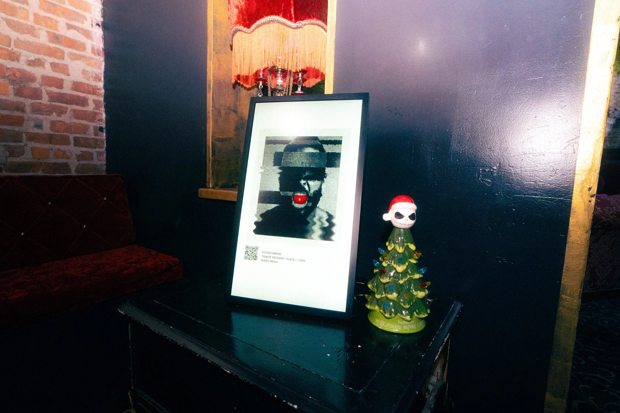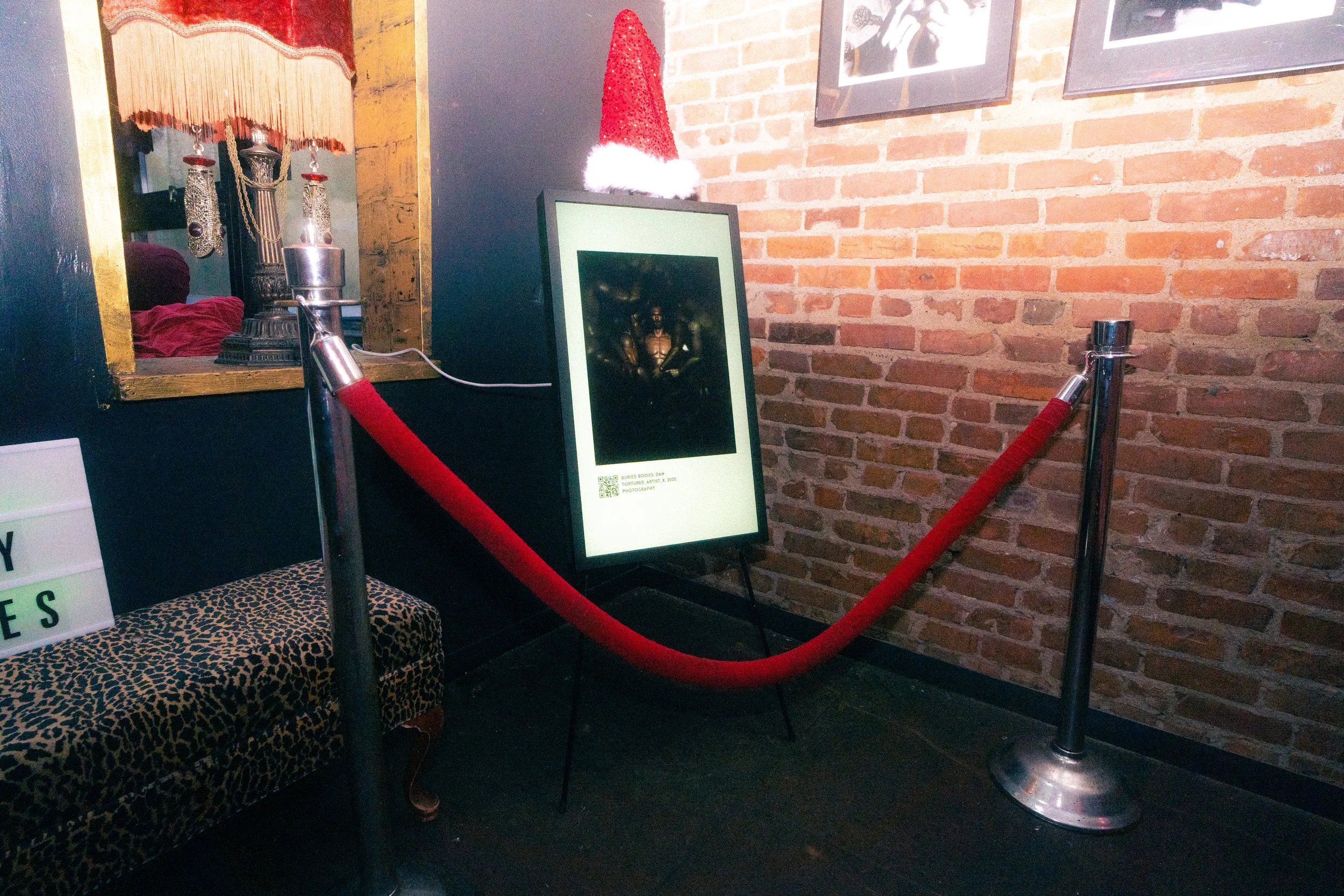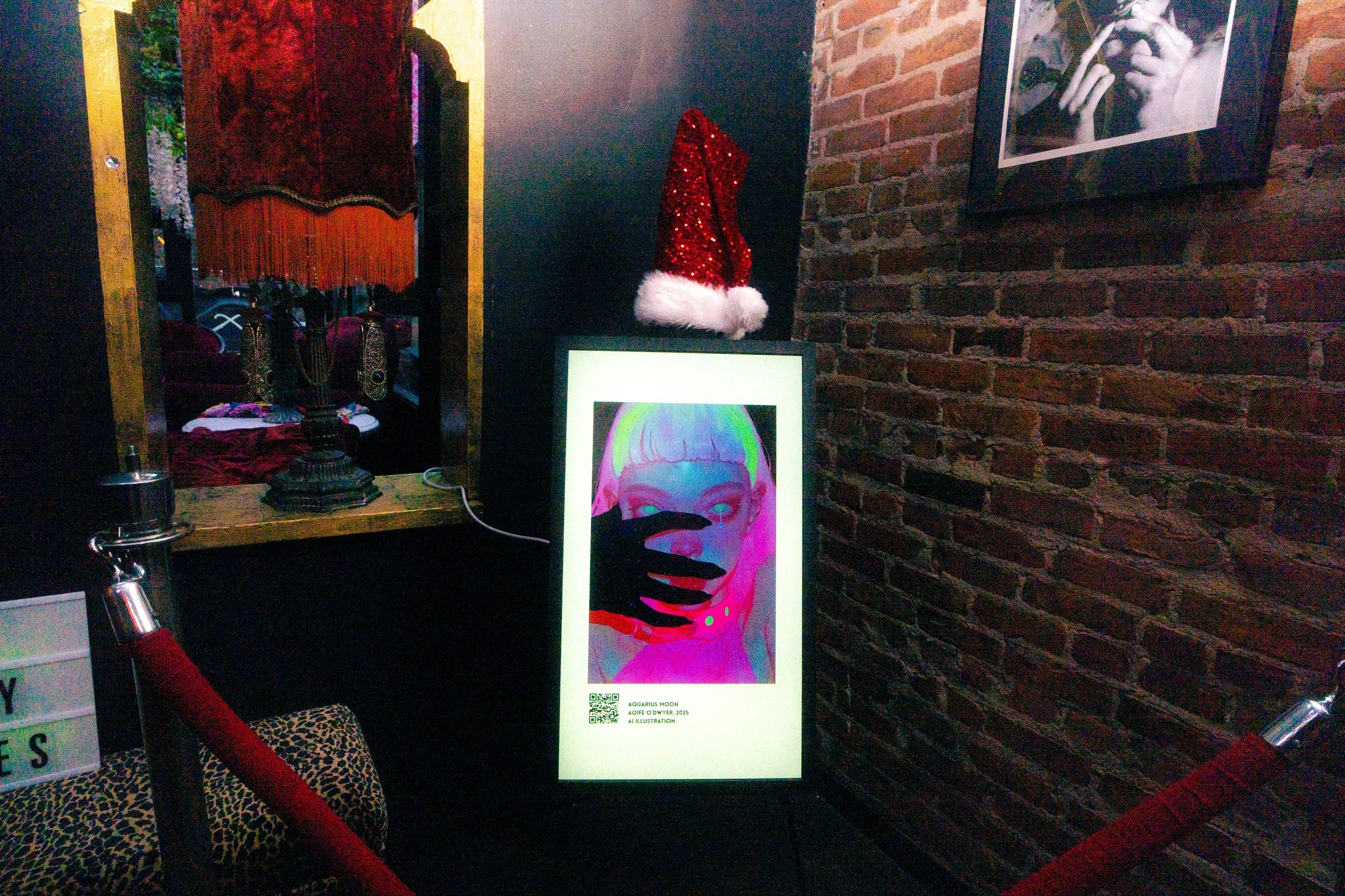 Between each round, audiences found themselves pulled toward the glowing heart of the event: an on-site digital art gallery installation. Far from a decorative backdrop, the exhibition acted as a gravitational force, drawing spectators to sit, pause, and resonate with works that haunted, humored, and provoked. The gallery presented a curated collection of queer, experimental visual works that reflected the night’s blend of playfulness and provocation.